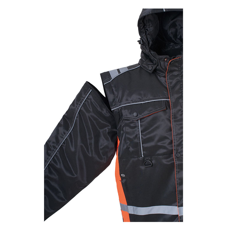 This 2in1 winter jacket is equipped with detachable sleeves that can be turned into a cotton vest. The sleeves are equipped with zippered pockets. The jacket is equipped with reflective strips at many places for maximum visibility outdoors. The jacket has many pockets to make your belongings safer. And also has a windproof design at the cuffs